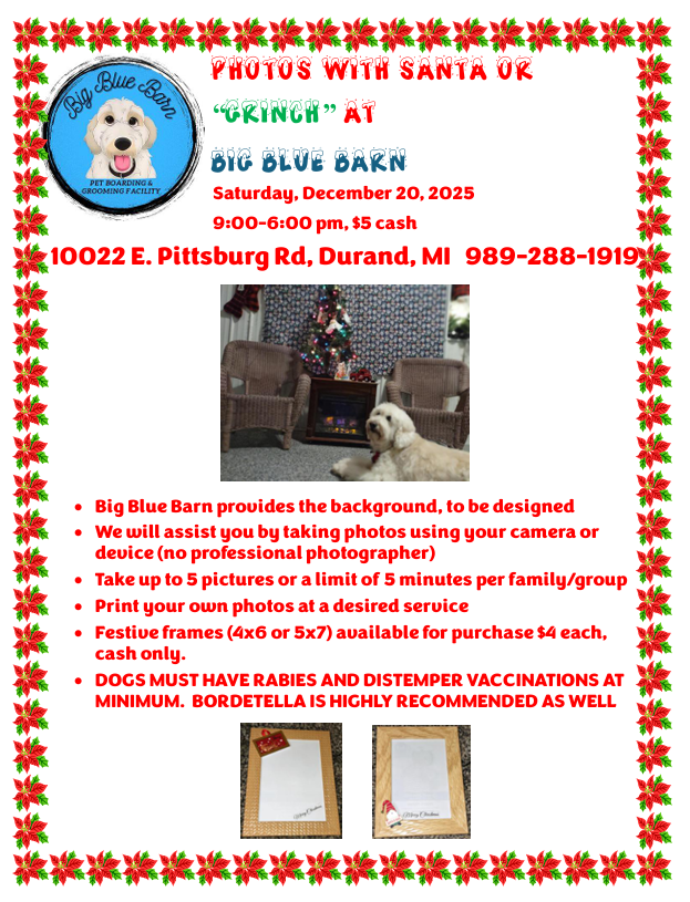 PHOTOS WITH SANTA AT BIG BLUE BARN! Only $5.00, click for details.